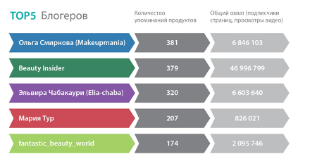 В топ наибольшего количества упоминаний органики вошли Ольга Смирнова (Makeupmania), Beauty Insider и Эльвира Чабакаури (Elia-chaba).