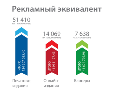Сравнение соотношений рекламного эквивалента демонстрирует первенство за печатными изданиями, что неудивительно – в среднем одна полоса в журнале стоила 417 тыс. рублей. Интересно, что суммарный рекламный эквивалент блогеров был практически равен общей цифре у онлайн-СМИ. Впрочем, если фото в Инстаграме или видео у популярного блогера еще сопоставимы по расценкам с онлайн-изданиями, то пост в ВК или Facebook ценится значительно меньше. Эти форматы сейчас не самые популярные и эффективные, в том числе и с точки зрения сторителлинга.
