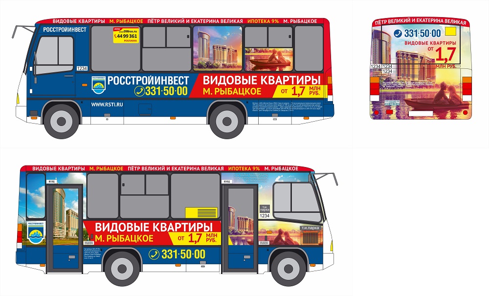 В макете автобусов дизайнеры постарались донести до аудитории все основные преимущества жилого комплекса – надежный застройщик, уникальная архитектура, расположение рядом с Невой и лесопарковой зоной, а также указали минимальную стоимость квартиры.
