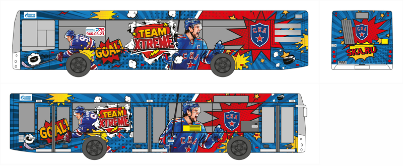 Рекламный макет выполнен в актуальной стилистике комиксов, на бортах автобусов красуются ключевые игроки – капитан Сергей Плотников и олимпийский чемпион Александр Барабанов, рвущиеся к победе. Исходный макет, предоставленный клиентом, был профессионально адаптирован под автобусы большой и средней вместимости.