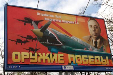 3. Советский истребитель Ла-5 конструктора Лавочкина изобразили на фоне фашистских бомбардировщиков Ju-87: