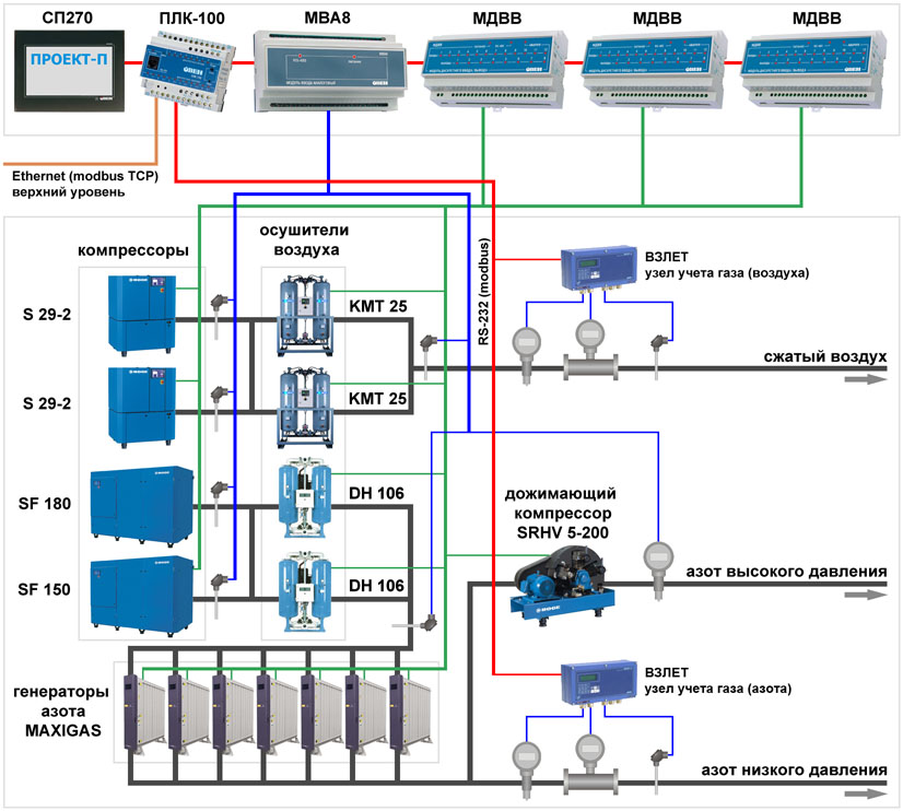 Основу системы управления азотно-компрессорной станции, созданием которой занималась компания «ПРОЕКТ-П» (г. Волхов Ленинградской обл.), составляют приборы ОВЕН: программируемый логический контроллер ПЛК100, модуль аналогового ввода МВА8, модули дискретного ввода-вывода ОВЕН МДВВ, панель оператора СП270. Датчики температуры и давления подключены к МВА8. Дискретные сигналы о состоянии оборудования поступают на модули МДВВ. Корректоры газа, входящие в состав узлов учета газа, подключены к ПЛК100 по интерфейсу RS-232. ПЛК периодически опрашивает модули ввода-вывода и корректоры газа, обрабатывает полученную информацию, выводит на панель оператора, а также передает информацию на верхний уровень. На панели оператора ОВЕН СП270 отображается мнемосхема азотно-компрессорной станции, на которой условно показаны оборудование станции, трубопроводы и параметры технологического процесса.