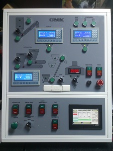 Все органы управления и информация о состоянии системы выведены на центральный пульт управления. Мнемосхема пульта управления выполнена в соответствии с эргономическими требованиями. Работу каждого дозатора выполняет отдельный локальный контроллер, программирование которого осуществляется с помощью панели оператора ИП320. Также на пульте расположена главная сенсорная панель оператора СП270, позволяющая следить за технологическим процессом приготовления бетона. На дисплей выведена только необходимая информация, позволяющая одним взглядом оценить состояние системы. С помощью панелей оператора ИП320 и СП270 с пульта управления оператор может давать необходимые команды. Главный экран панели ИП320 позволяет выбирать рецепт в соответствии с маркой бетона (всего – до 999). С него можно назначить объём выпускаемой смеси с необходимой точностью, установить номер заказа и прочие необходимые настройки.