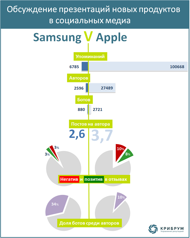 Масштаб и характер эмоционального превалирования Apple над Samsung можно изучить в цифрах по следам презентаций новинок обоих производителей мобильных гаджетов. Презентации прошли почти одновременно и широко обсуждались в социальных медиа. Сообщения в соцмедиа на русском языке, относившиеся к данным событиям и продуктам, были собраны и проанализированы с помощью системы мониторинга «
