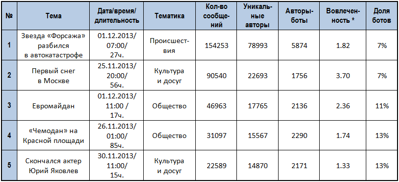 * Вовлеченность рассчитывается как среднее количество сообщений, опубликованных одним автором. Показатель характеризует уровень интереса аудитории соцмедиа к обсуждаемым событиям: 1 – отражает минимальный уровень вовлеченности, 3 и более – высокий уровень вовлеченности.