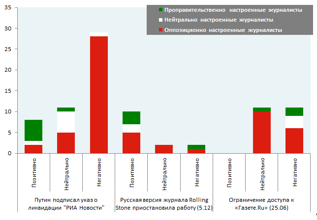 Сопоставление этих данных показало, что, несмотря на то что РИА Новости является правительственных информационным агентством, наиболее негативно к новости отнеслись «оппозиционные» журналисты. В случае кейсов с закрытием журнала Rolling Stone и ограничением доступа к Газете.ру ситуация была противоположной.