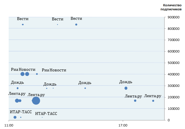 Как видно из графика ниже, среди пяти наиболее популярных СМИ, имеющих аккаунты в Твиттере, наибольшее внимание Указу о ликвидации РИА Новости уделила Лента.ру: ресурс опубликовал наибольшее число сообщений о событии в течение самого продолжительного времени. И именно публикации Ленты.ру нашли наибольший отклик у аудитории (максимальное количество репостов на пост, что на графике ниже соответствует диаметру каждого круга).