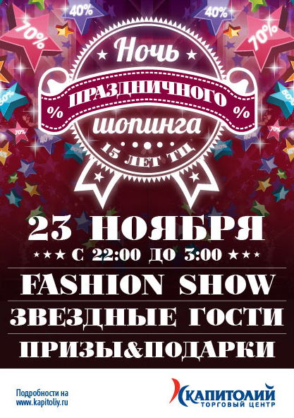 ТЦ «Капитолий» Марьина Роща в честь своего пятнадцатилетия сообщает о грандиозном событии осени: ночь с 23 на 24 ноября объявляется «Ночью шопинга»!