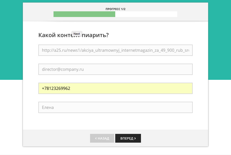 Второй шаг - выбор площадок, в которых нужно пиарить контент (Вконтакте, Facebook, Одноклассники, Twitter) и желаемое количество постов.