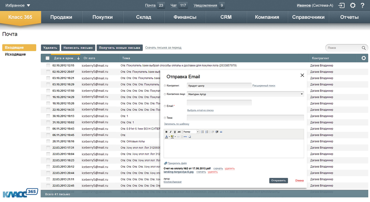 Разработчики Класс 365 представили встроенный почтовый клиент, который сделал возможным отправку и получение e-mail непосредственно из CRM системы Класс 365 Так, счет, коммерческое предложение, накладная, счет-фактура и любой другой документ можно отправлять контрагенту буквально в 2 клика. При отправке писем в поле «Получатель» автоматически подставляется адрес контрагента, а отправляемый документ конвертируется в pdf-формат и пересылается в виде вложения. Интегрированный почтовый клиент позволяет использовать пользовательские шаблоны для написания писем и сохранять полученные от контрагентов файлы.