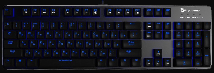 Клавиатура QCYBER DOMINATOR оснащена 1,5-метровым кабелем USB 2.0 в тканевой оплётке и позолоченным разъёмом, что также продиктовано вопросами износоустойчивости и надёжности конструкции. Подсветка клавиш, выполненная на синих светодиодах, поддерживает пять режимов интенсивности по блокам (для FPS игр, MOBA игр, стандартный режим и т. д.), плюс различные эффекты пульсации. Включение и настройки режимов подсветки осуществляется с помощью определенных, интуитивно понятных комбинаций кнопок.