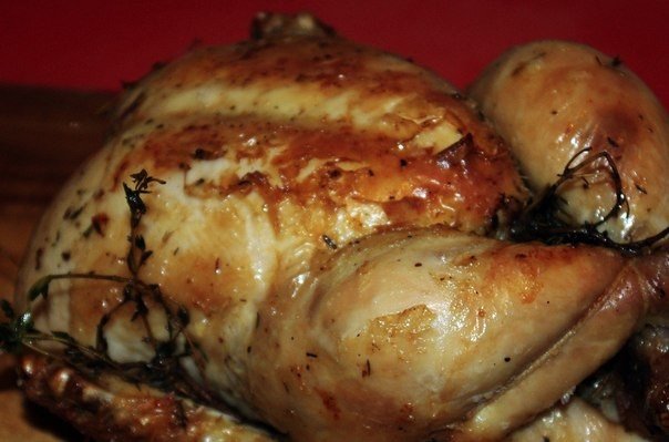 В нижнюю часть духовки ставим противень со слоем соли на фольге и разогреваем духовку до 200 градусов. Затем фаршируем брюшко курицы дольками чеснока, петрушкой и тимьяном. Солим, перчим изнутри и снаружи и выкладываем курицу на решётку, грудкой вверх.