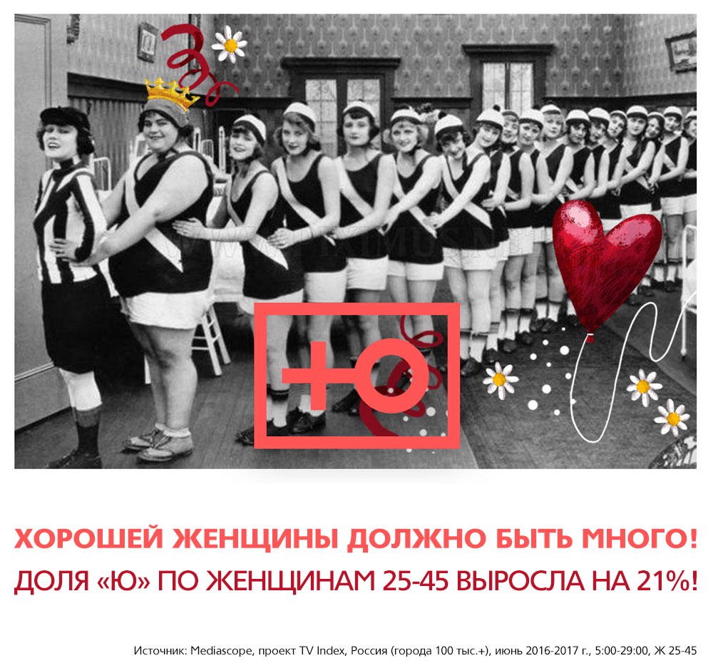 11 июля 2017, Москва. Доля канала «Ю» за июнь 2017 по отношению к тому же месяцу прошлого года выросла на 21% по аудитории женщины 25-45.