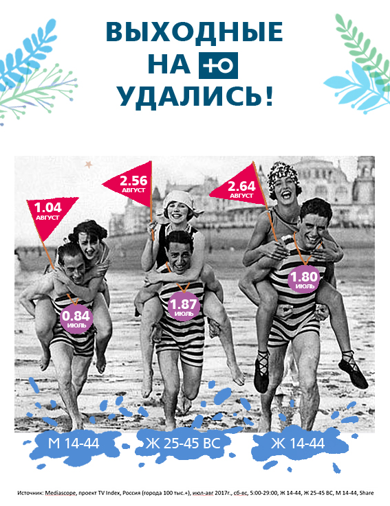 В августе 2017 года выходные дни на канале «Ю» прошли значительно успешнее по всем ключевым целевым аудиториям по сравнению с июлем этого же года.