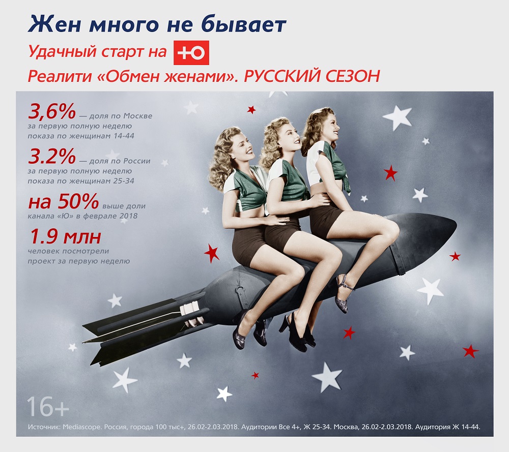 Средняя доля реалити «Обмен женами» по Москве по женской аудитории в возрасте 14-44 лет за первую неделю показа составила 3,6%. Это в два раза выше средней доли канала «Ю» по Москве в феврале этого же года.