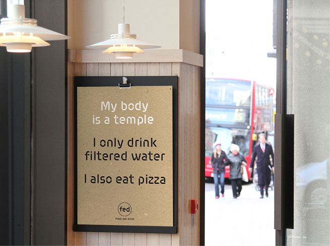 По словам Марчелло Минале (Marcello Minale), директора лондонского офиса Минале Таттерсфилд, новый бренд для сети ресторанов и одновременно private label для линейки собственных продуктов должен изменить отношение людей к правильному питанию. Вы можете получать удовольствие от пиццы или простой воды, если и то и другое приготовлены и поданы правильно.