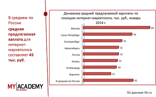 Нехватка квалифицированных кадров на рынке интернет-маркетинга стимулирует стремительный рост зарплаты, пишут аналитики East-West Digital News, ужесточается конкуренция между работодателями в борьбе за сотрудников и, следовательно, возрастают зарплаты. Так, специалиста с опытом можно привлечь от 50 тыс. рублей в месяц, но их стоимость доходит и до 100 тыс.