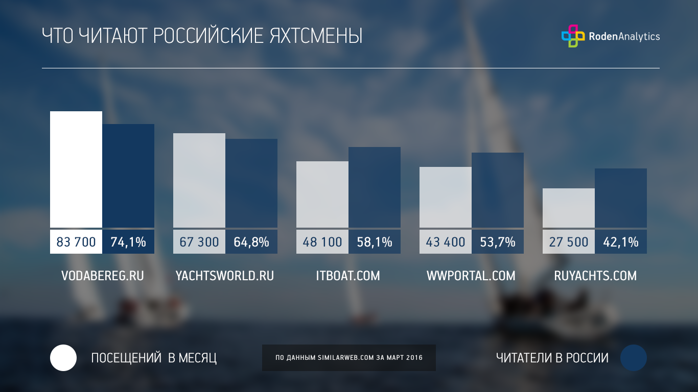 Специалисты Roden Analytics представили инфографику по самым популярным российским интернет-СМИ в сфере яхтенного и парусного спорта. Предлагаем вам ознакомиться с полученными цифрами и показателями за март 2016 года по данным от аналитической платформы SimilarWeb.
