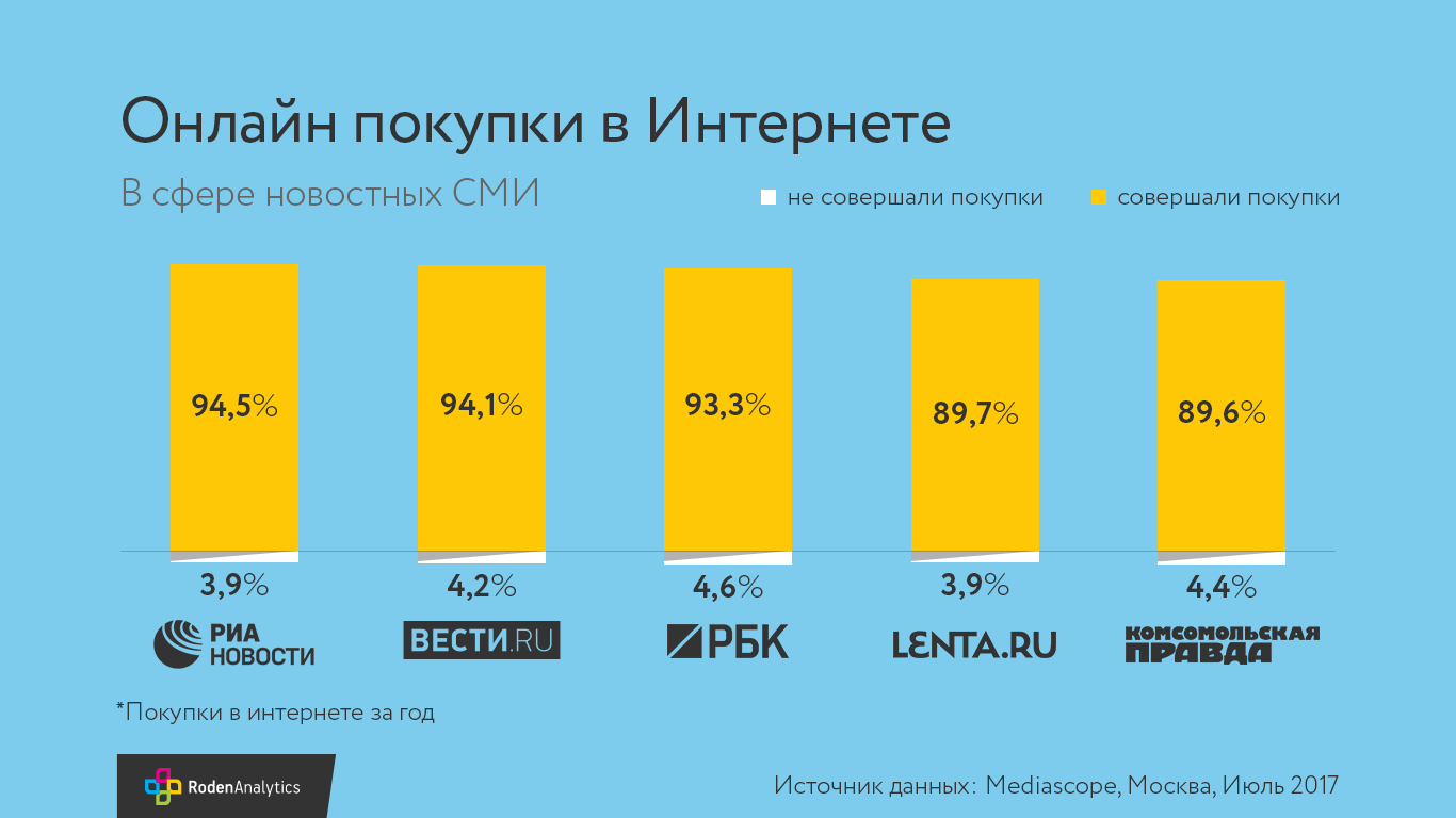 Самыми активными онлайн покупателями среди московской аудитории новостных СМИ стали посетители сайтов РИА Новости, ВЕСТИ.ru и РБК #RodenAnalytics