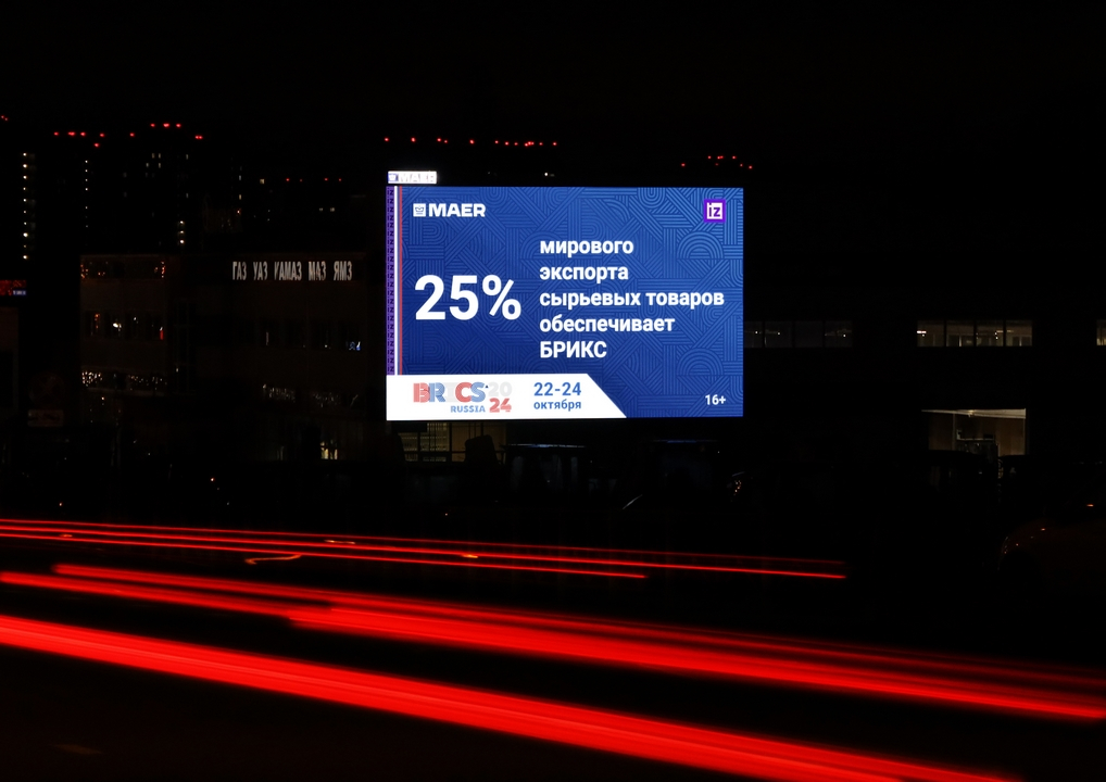 В преддверии БРИКС на всех медиафасадах МАЕР зрители увидели важные показатели, характеризующие экономический и политический потенциал объединения, которое становится ключевым игроком в современном мире. С помощью наглядной инфографики телеканал «Известия» показал рост объединения, рассказал, какую долю оно занимает в мировой торговле, промышленности, сколько на эти страны приходится полезных ископаемых, топливных ресурсов и запасов золота.