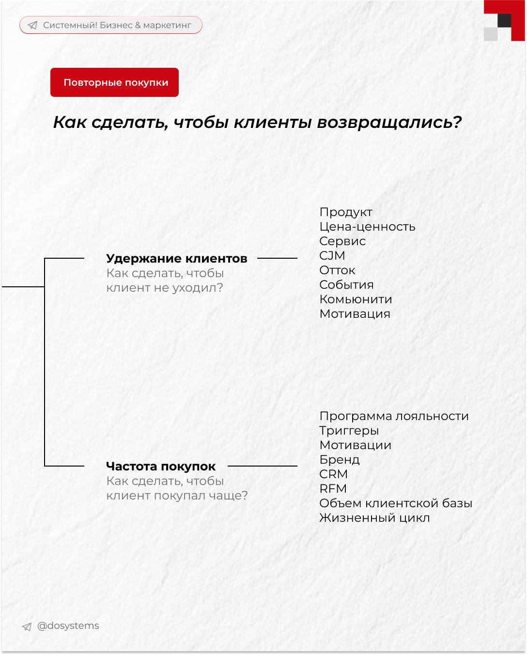 Самый дешевый (и один из самых эффективных) в работе рычаг – повторные покупки. Клиент уже вас знает, уже вам доверяет, уже купил. Но почему-то именно с ним работают меньше всего!
