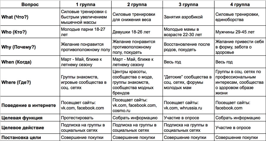Попробуем составить портрет ЦА фитнес-клуба. Вроде все понятно, ЦА — мужчины 18 - 45 лет и нечего больше тут думать. Теперь разрабатываем сегментацию по модели 5W: