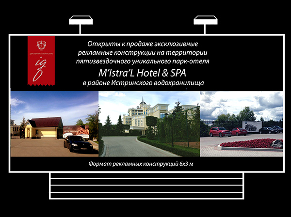Оператор наружной рекламы IQ выполнил установку сети рекламных конструкций формата 6х3 м на территории парка-отеля M’Istra’L Hotel & SPA на Истринском водохранилище.