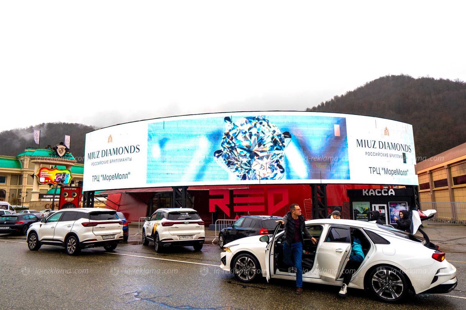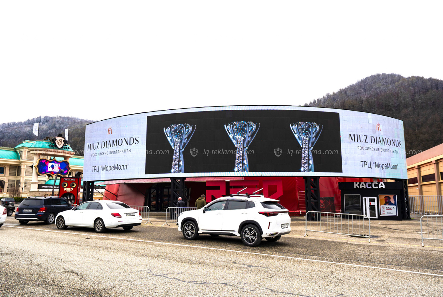 Размещение видеоролика проходит на современном медиафасаде Red Arena, что позволяет эффективно донести рекламное сообщение до аудитории гостей элитного курорта. Рекламируются эксклюзивные ювелирные изделия бренда.