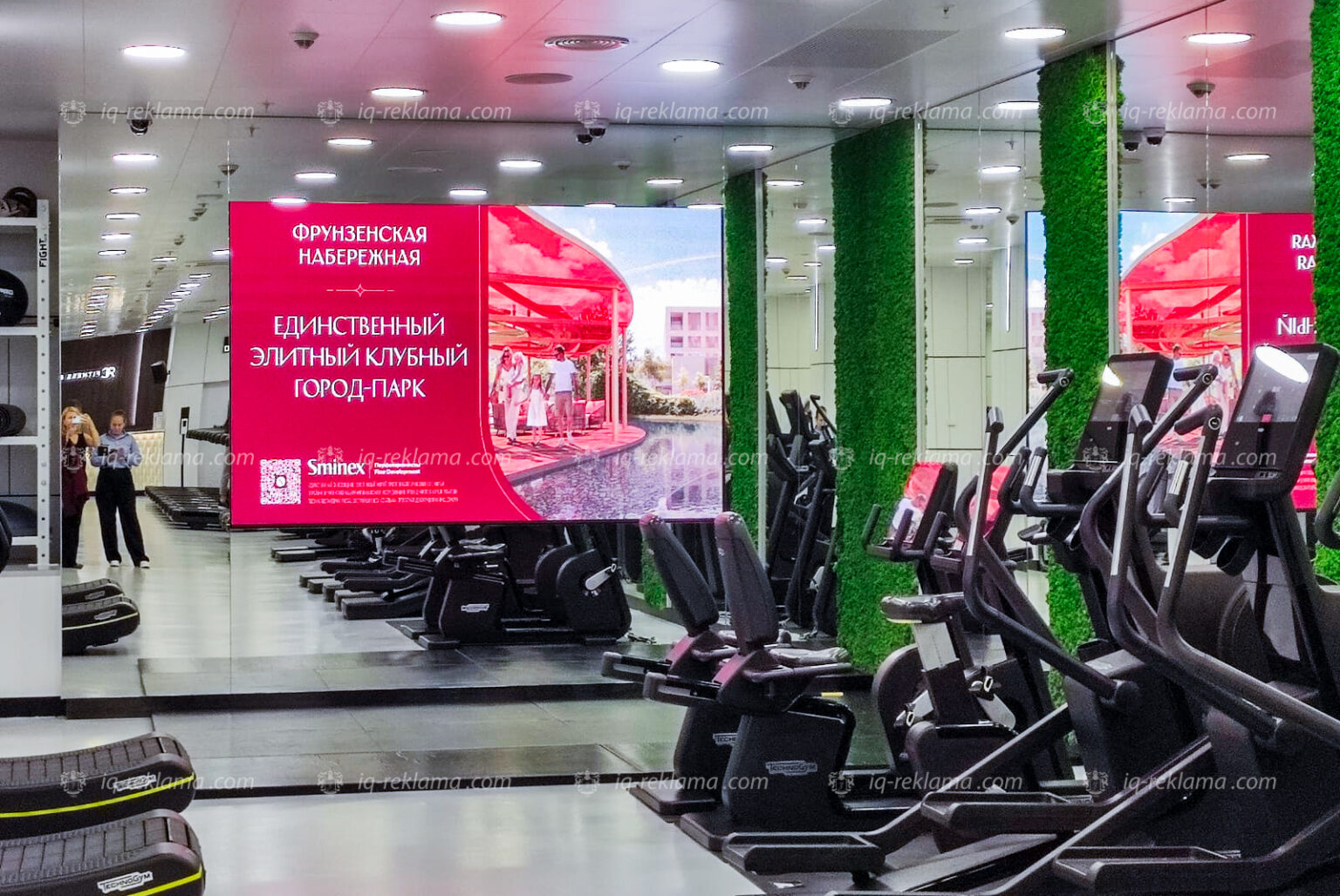 Фитнес-клуб с атмосферой роскоши. Digital-экраны обеспечили естественную интеграцию рекламы в повседневную жизнь постоянных клиентов.