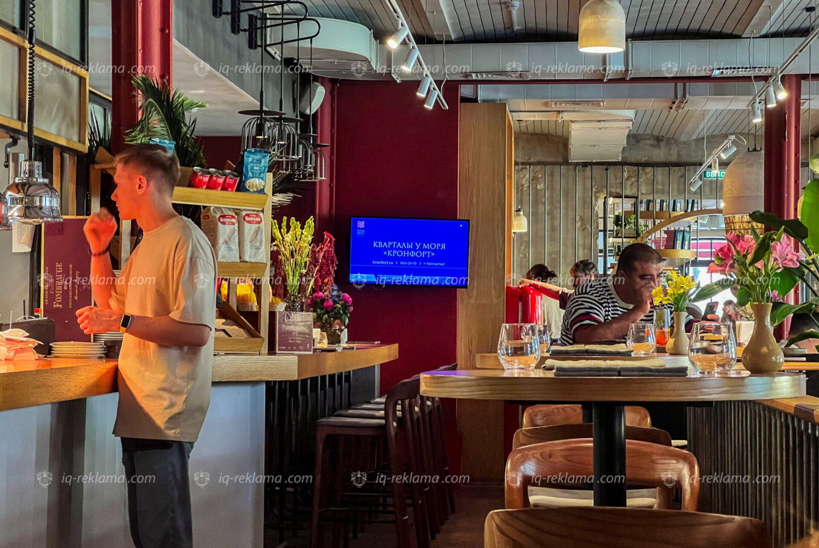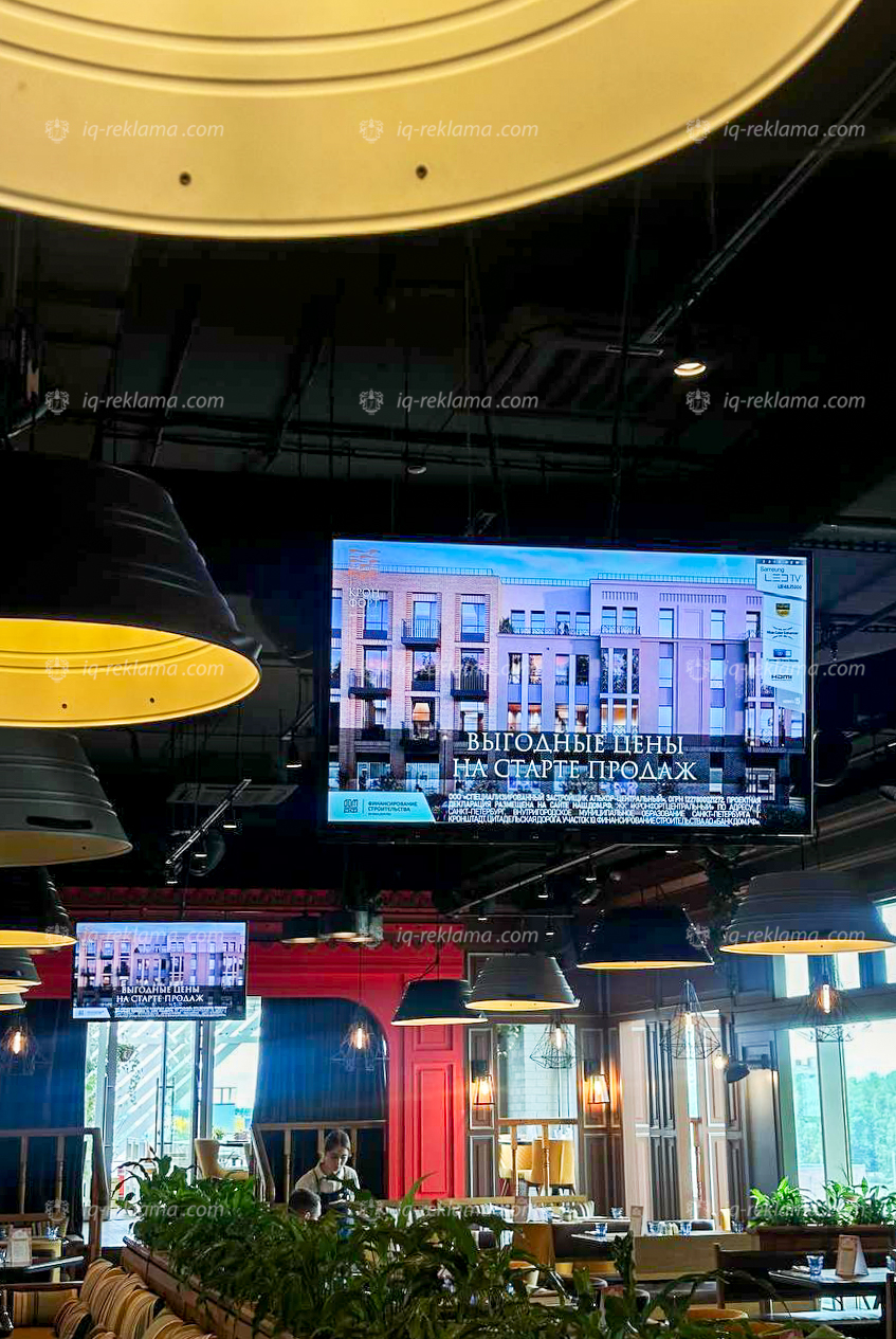 Размещение индор-рекламы проходило на видеоэкранах ресторанов: Ginza, Capuletti, Katyusha, SunDay Ginza, Terassa, Volga-Volga, «Баклажан», «Веранда», «Корюшка», «Кукумбер», «Ларисуваннухочу», «Маис», «Маймун», «МамаLыga», «Мансарда», «Мари Vanna», «Москва», «НАША Dacha», «Пряности & Радости», «Пури», «Рибай», «Стейк by steak», «Сули Гули», «Сушки на Макушке», «Хочу Харчо», «Юность», «Джельсомино café», «Плюшкин».