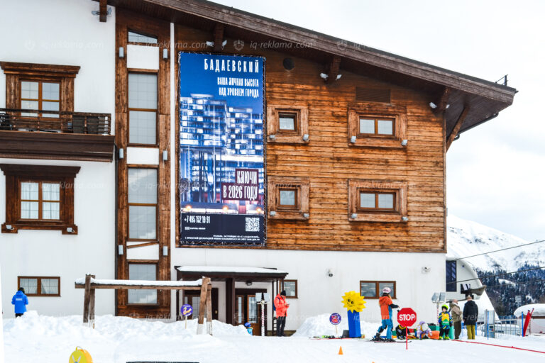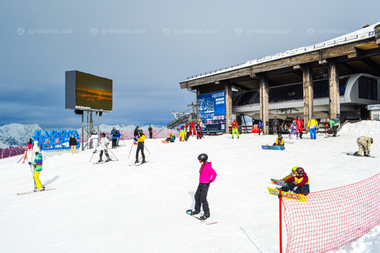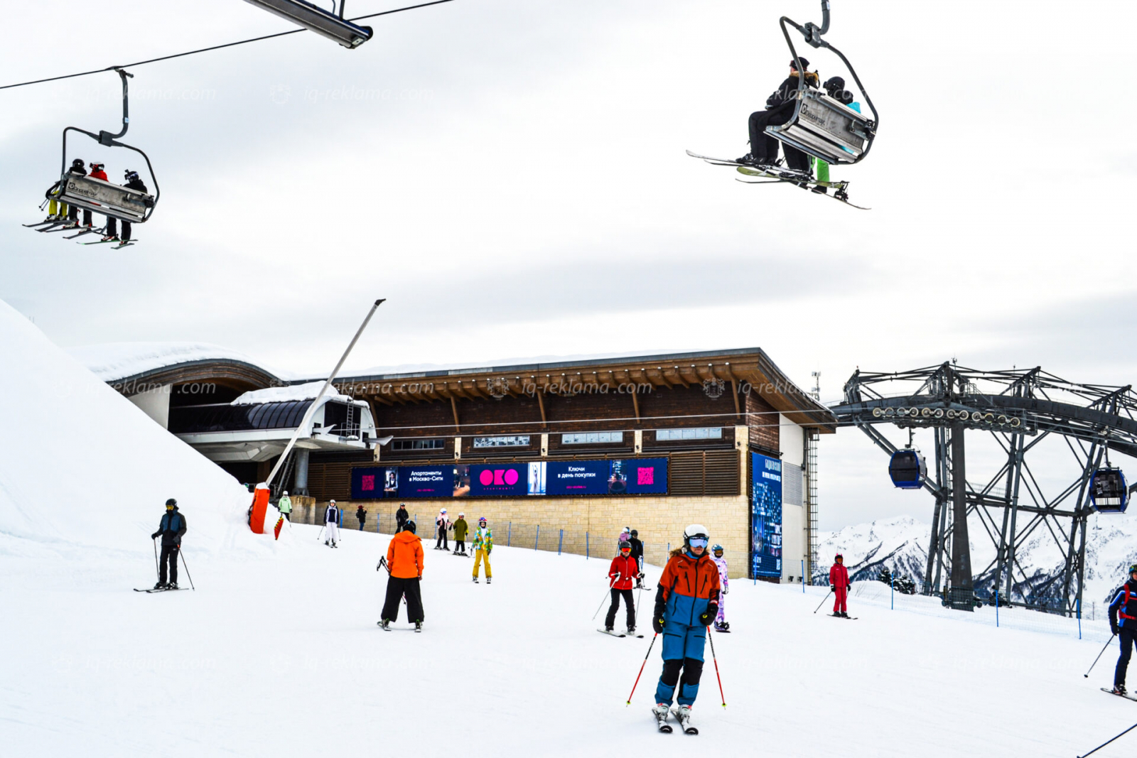 Рекламные рамки стратегически размещены на фасадах канатных дорог и вдоль ключевых трасс, что гарантирует максимальную видимость среди гостей курорта. Благодаря такому расположению рекламные сообщения охватывают практически все маршруты передвижения посетителей — от подъёмников до спусков, сопровождая их на протяжении всего пребывания и оставляя яркий эмоциональный отклик. Ежемесячно курорт принимает свыше 750 тысяч гостей, что превращает рекламные поверхности в канал коммуникации с многотысячной премиальной аудиторией.