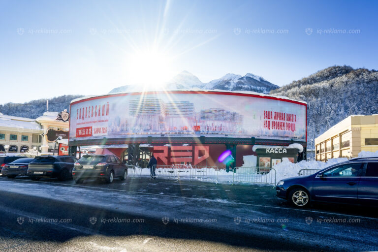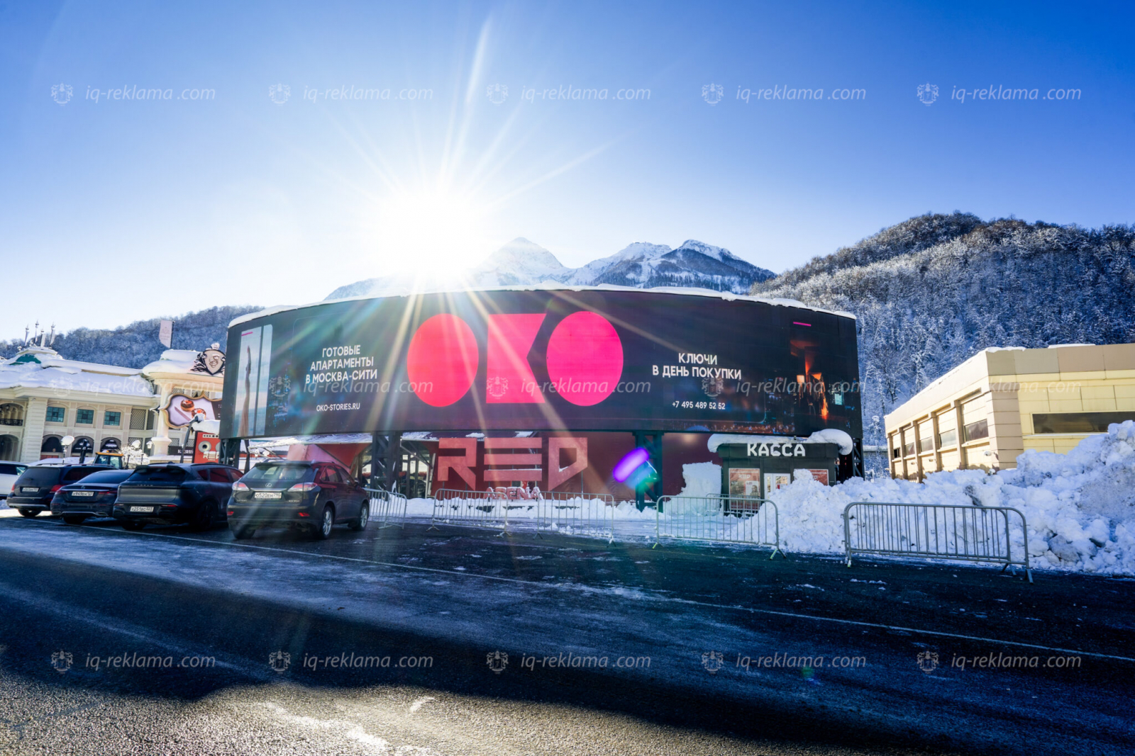 Красная Поляна — живописный курортный комплекс в сердце горного Кавказа, известный своим всесезонным форматом отдыха. В зимний период здесь востребованы горнолыжные трассы, летом — пешие и велосипедные маршруты, что делает курорт привлекательным в любое время года. Локация отличается развитой инфраструктурой: уютные кафе, рестораны с панорамными видами и разнообразные развлекательные зоны создают атмосферу премиального комфорта. Это неизменно привлекает взыскательную VIP-аудиторию, ориентированную на здоровый образ жизни и качественный досуг. Ключевую роль в визуальной коммуникации курорта играет медиафасад RED ARENA — крупнейшая рекламная поверхность Красной Поляны, обеспечивающая стабильно высокий охват до 2 миллионов посетителей ежемесячно.