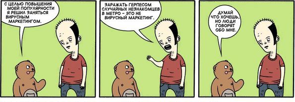 Ну как бы понимаете, человек (читатель, зритель) – он не целевая аудитория, у него нет переключателя, он, сцуко эмоционален, а копирайтер – рационален. Копирайтер это тупой генератор правильных словосочетаний грамотно написанных слов, а читатель - это живой человек, который звучит гордо. У человека нет переключателя, а у маркетолога и копирайтера – есть. Знаете, как это работает? Дайте такому копирайтеру написать статью, например про лабутены– он напишет жуткую жвачу со страшными словами «премиальный бренд, целевая аудитория – премиум, лакшери, бла, бла, бла», а в пятницу после 5 он пойдет в караоке и будет орать в караоке «на лаааабутенах нах и в о…ительных штанах». Вот он переключатель.
