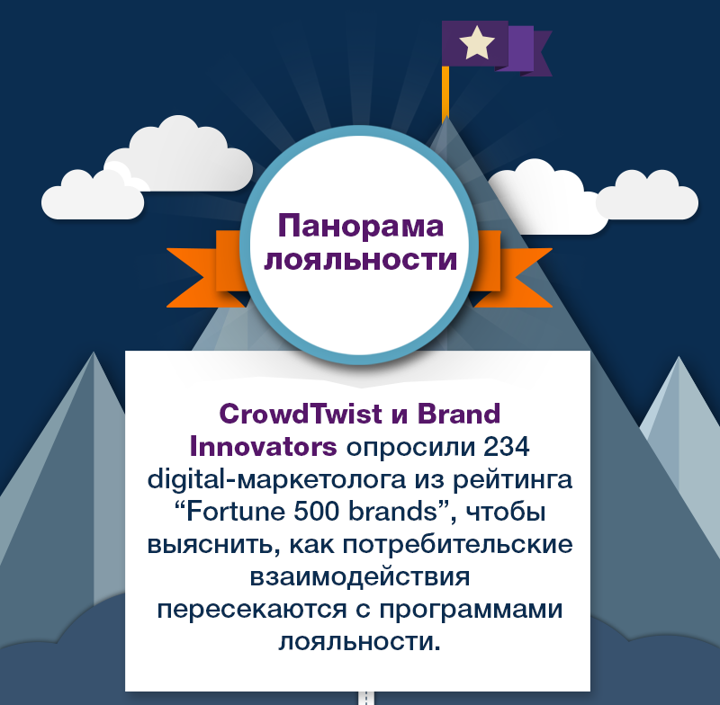 CrowdTwist, ресурс, который занимается поиском мультиканальных решений для выстраивания потребительской лояльности, и Brand Innovators, специализирующиеся на электронных медиа, опросили 234 digital-маркетолога, которые представляют бренды из рейтинга Fortune 500 (рейтинг 500 крупнейших мировых компаний, критерием составления которого служит выручка компании), чтобы выяснить, как потребительские взаимодействия пересекаются с программами лояльности.