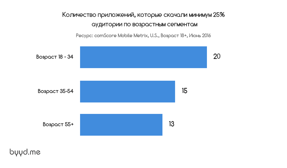 При просмотре статистики приложений, которые скачали минимум 25% пользователей из каждой демографической группы, оказалось, что у миллениалов количество часто используемых приложений больше, чем у более взрослых слоев населения. Данные ComScore Mobile Metrix указывают на то, что есть 20 приложений, которые, по крайней мере, один из четырех пользователей в возрасте от 18 до 34 лет использует раз в месяц, по сравнению с 15 приложениями среди возрастной группы от 35 до 54 лет и 13 — среди тех, кто старше 55.