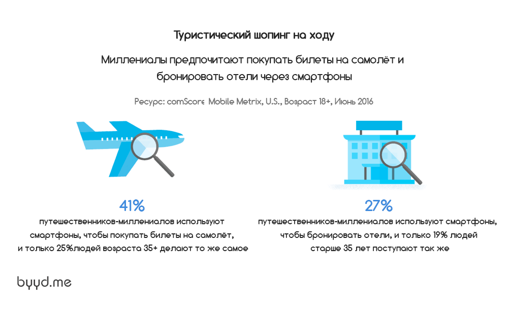 Июньское исследование comScore Mobile Metrix говорит о том, что миллениалы чаще всего делают покупки билетов на самолеты и бронируют номера в отелях с помощью смартфонов. 41% миллениалов-путешественников использовали смартфон для покупок билетов, и только 25% людей старше 35 лет делали то же самое. 27% миллениалов-путешественников использовали смартфон для бронирования номеров в отелях. Те же действия совершали лишь 19% людей старше 35 лет.