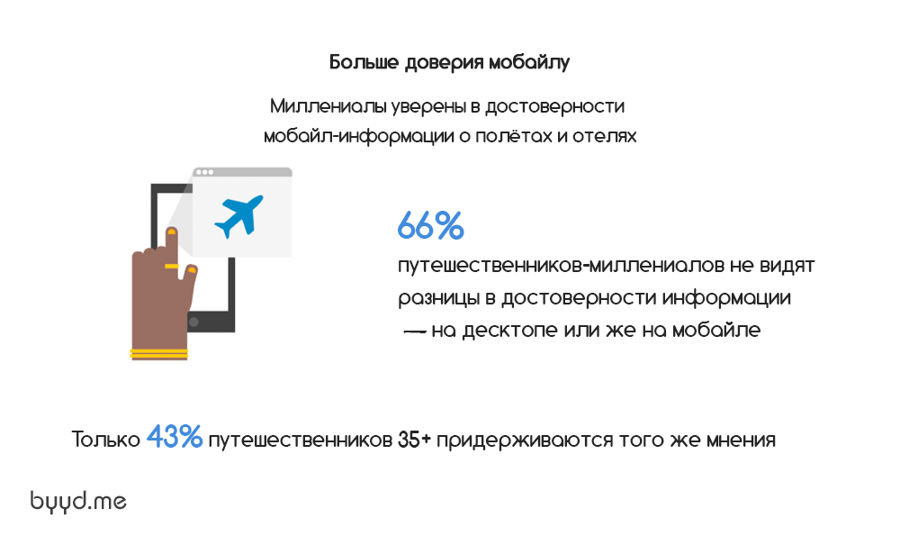 Миллениалы уверены в достоверности информации о полётах и отелях, находящейся в смартфонах. 66% миллениалов-путешественников уверены, что могут найти одинаковую информацию о полетах и отелях как на мобильных устройствах, так и на компьютерах, в то время как только 43% путешественников старше 35 лет доверяют мобайлу в той же мере, что и десктопу.