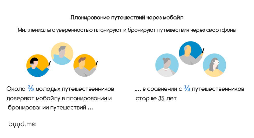 Миллениалам удобно планировать и бронировать путешествия с помощью смартфонов. Планирование целого путешествия с помощью смартфона комфортно для 2/3 молодых путешественников, по сравнению с 1/3 путешественников в возрасте от 35 лет и старше.