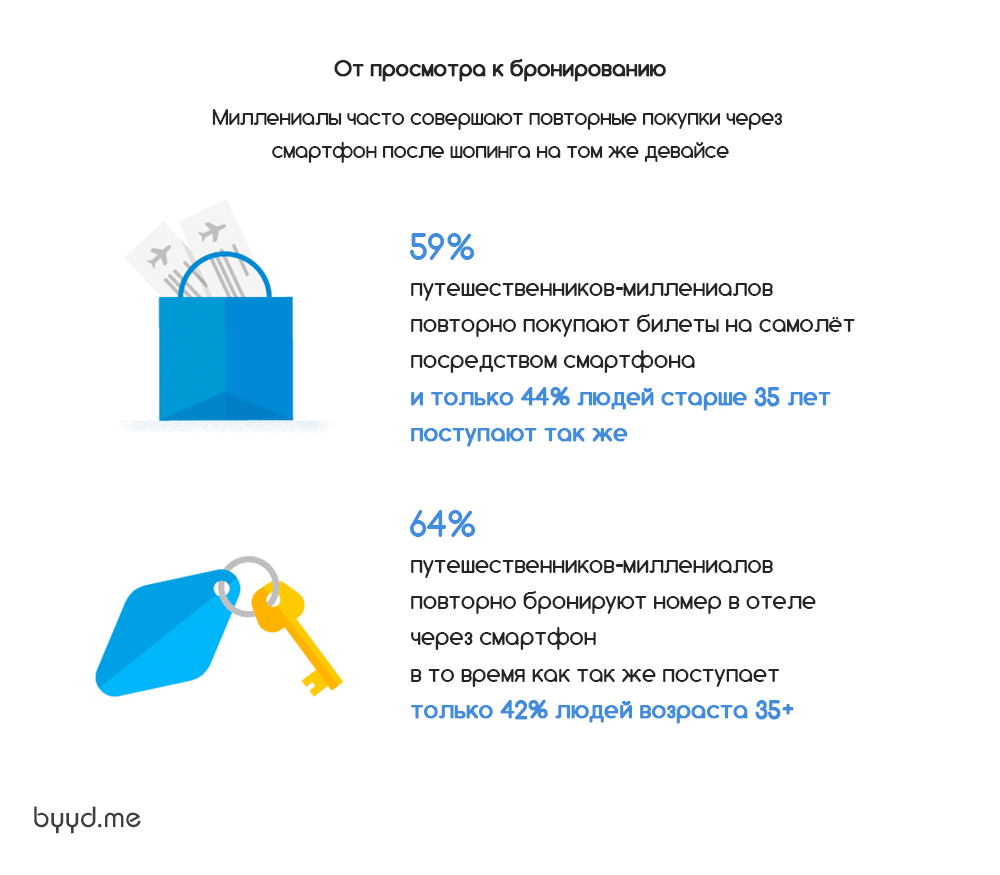 Миллениалы часто делают повторные покупки с помощью смартфонов. 59% миллениалов-путешественников, как правило, повторно покупают билеты на самолет с помощью смартфона после первой покупки, в то время как 44% из тех, кто старше 35 лет, поступают аналогичным образом.