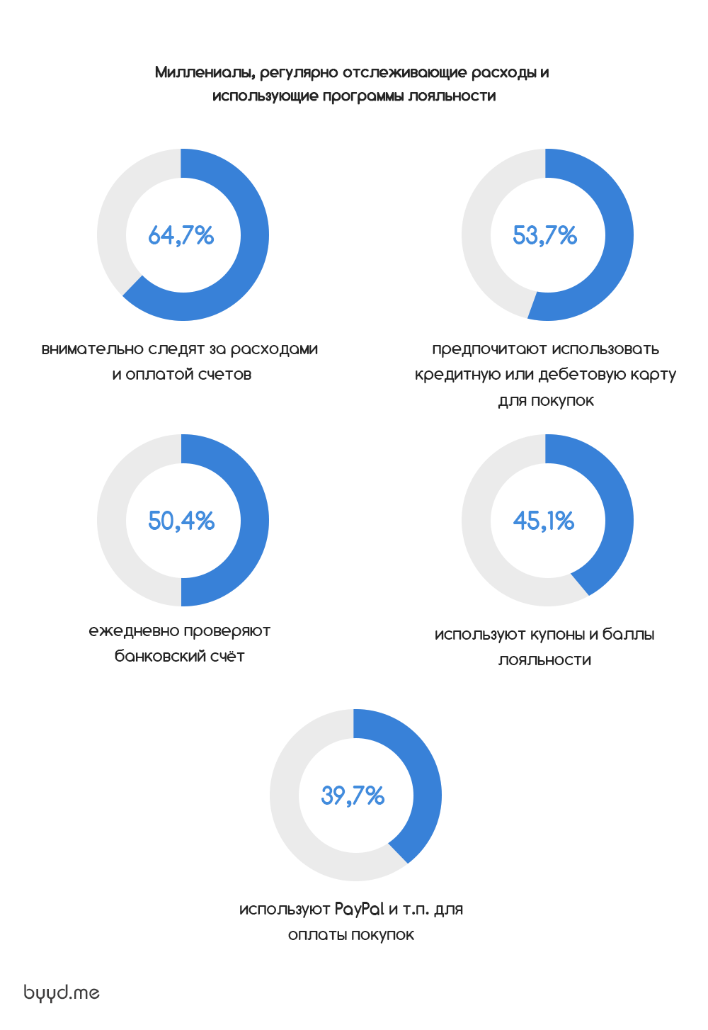 В дополнение к попытке контролировать свои расходы, миллениалы также внимательно следят за своим банковским балансом, больше половины (50.4%) проверяет свой баланс ежедневно. Для экономии денег некоторые миллениалы (45,1%) используют баллы за лояльность и купоны. Только 39,7% миллениалов предпочитают использовать PayPal для онлайн-покупок.