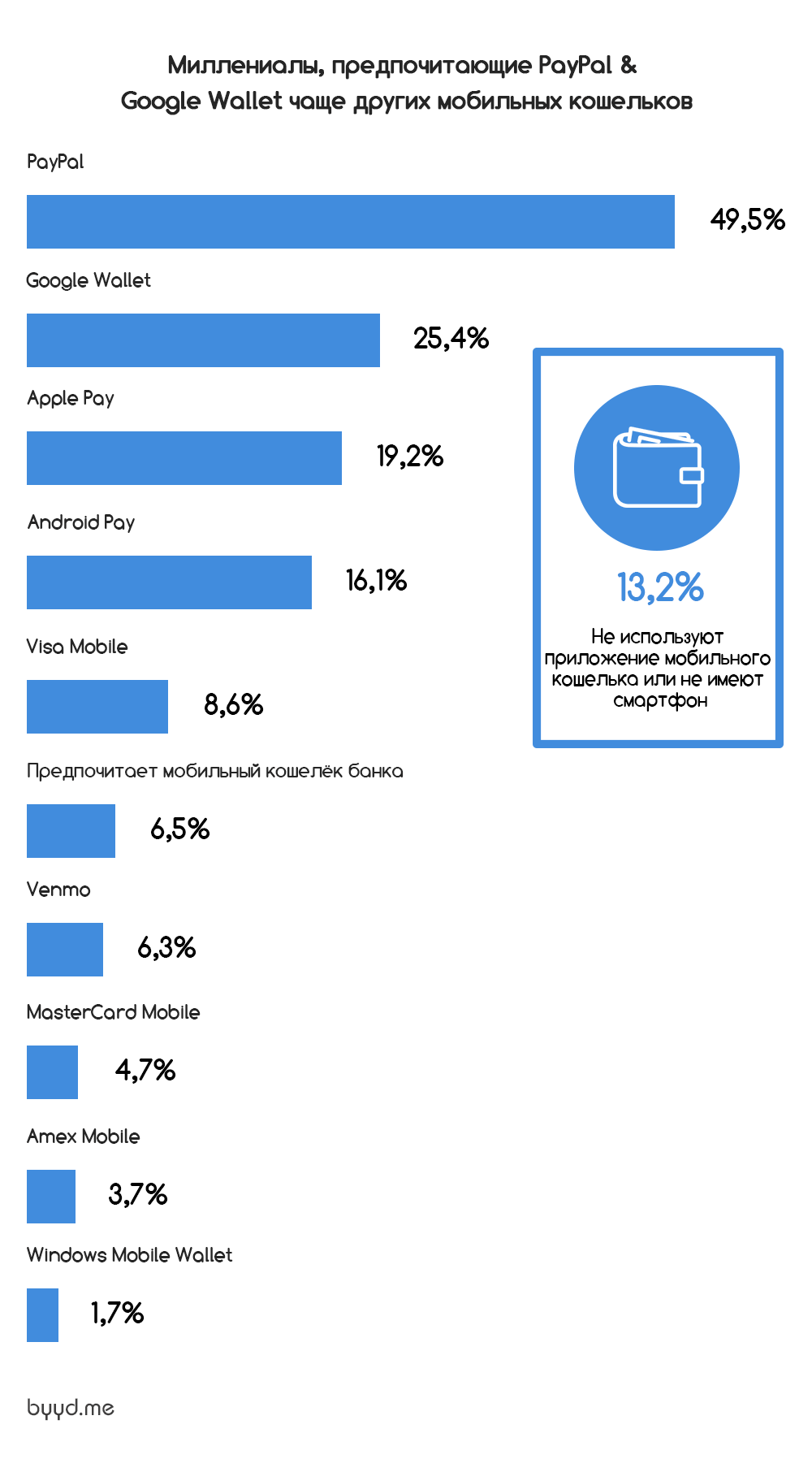 Когда CCG Catalyst спрашивал миллениалов, какие мобильные кошельки они предпочитают, половина (49,5%) опрошенных упомянула PayPal. Google Wallet упоминался почти в два раза меньше (25,4%) , а 19,2%, миллениалов выбирают Apple Pay.