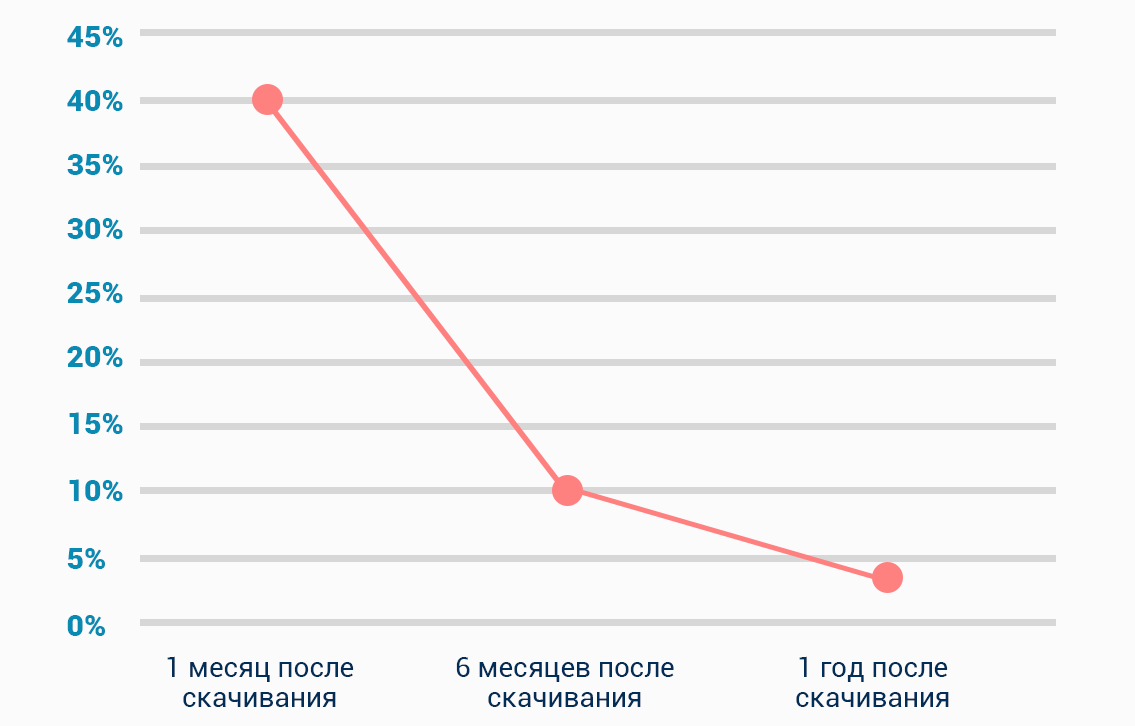 Мир мобильных приложений кишит историями успеха с многомиллиардными бюджетами. Но, как полагается, за успехом стоит и множество трудностей, основная из которых — отток клиентов. В среднем только 25-40% клиентов запускают приложение после первой недели использования. Из года в год это число уменьшается на 4%.