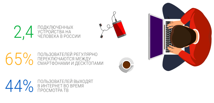 Сегодня на одного человека в России приходится 2,4 подключенных устройства. Смартфон — первое устройство, за который берется пользователь для выхода в Интернет.