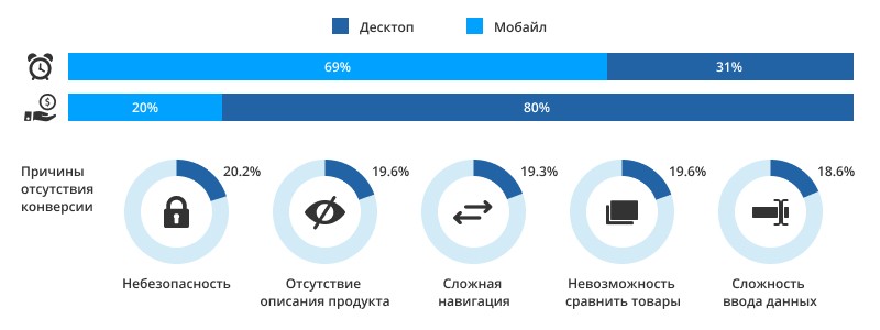 Посмотрите внимательно на диаграммы. Исследование Comscore показывает 5 причин, по которым страдает конверсия на мобильных устройствах: