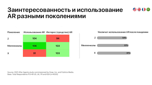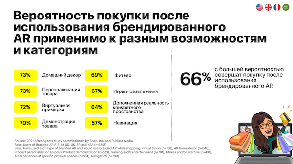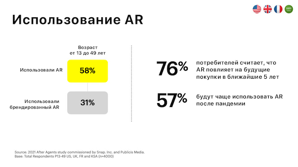В блоге Snapchat for Business опубликовали исследование, проведенное совместно с партнерами Publicis Media и консалтинговой компанией Alter Agents о том, как фирменный AR-контент брендов или рекламный контент с AR влияет на покупки и взаимодействие пользователей с брендами в 2021 году. В исследовании приняли участие несколько рынков: США, Великобритания, Франция и Саудовская Аравия.