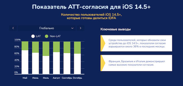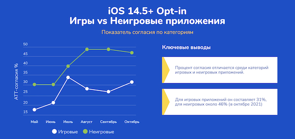 Кстати, по данным AppsFlyer, которые делают срез данных на эту тему, начиная с мая 2021 года, в октябре процент согласия на отслеживание выше — 46%.