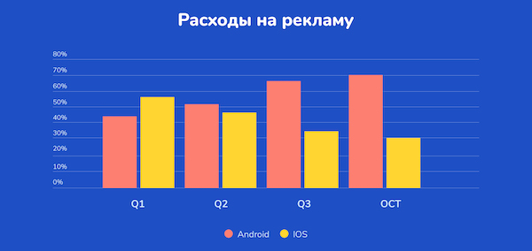 Судя по их внутренней статистике, в первом квартале 2021 рекламодатели потратили 44% бюджета на Android, во втором квартале цифра увеличилась до 51%, а в третьем — до 68%. И хотя общие бюджеты на мобильную рекламу остаются стабильными, рекламодатели все-таки хотя вкладывать больше средств в адресные каналы, какими являются сегодня приложения на платформе Android.