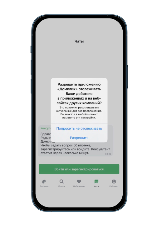 Вот, например, как выглядит окошко на запрос отслеживание в приложении «ДомКлик». В строке цели пишут: «Это позволит рекомендовать актуальные для вас предложения. Вы можете в любой момент изменить настройки».