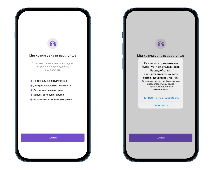В-третьих, нельзя ограничивать доступ к функционалу приложения до того, как пользователь даст согласие на отслеживание. Даже если он отказался, приложение должно быть доступно с максимумом своих опций, как и для тех, кто все-таки согласился.