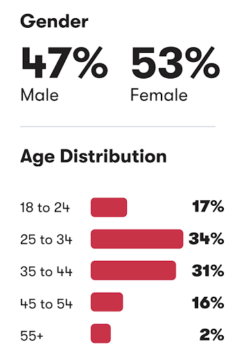 По демографическому разделению большинство пользователей, которые планируют шопинг в этот период, женщины (53%). Мужчины составляют 47%. По возрасту — в большей степени нацелены на покупки миллениалы от 25 до 34 лет (34%). Но группа от 35 до 44 лет не сильно отстает (31%).